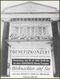 Mitte der 80er Jahre gab es schon erste Überlegungen des damaligen Ratsmitgliedes und Musikschulleiters Helmut Maas, das Universum zu erhalten und z.B. für gelegentliche Auftritte der Musikschule zu nutzen. Nach und nach wurde die Bevölkerung für das Thema sensibilisiert. Schließlich gelang es dem Shanty-Chor der MK Bünde, durch gleich mehrere ausverkaufte Benefizkonzerte unter dem Motto "Weihnachten auf See" in der Weihnachtszeit 1992 im notdürftig hergerichteten Universum auf das Kleinod erfolgreich aufmerksam zu machen.